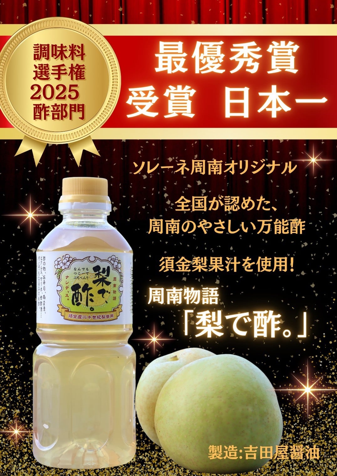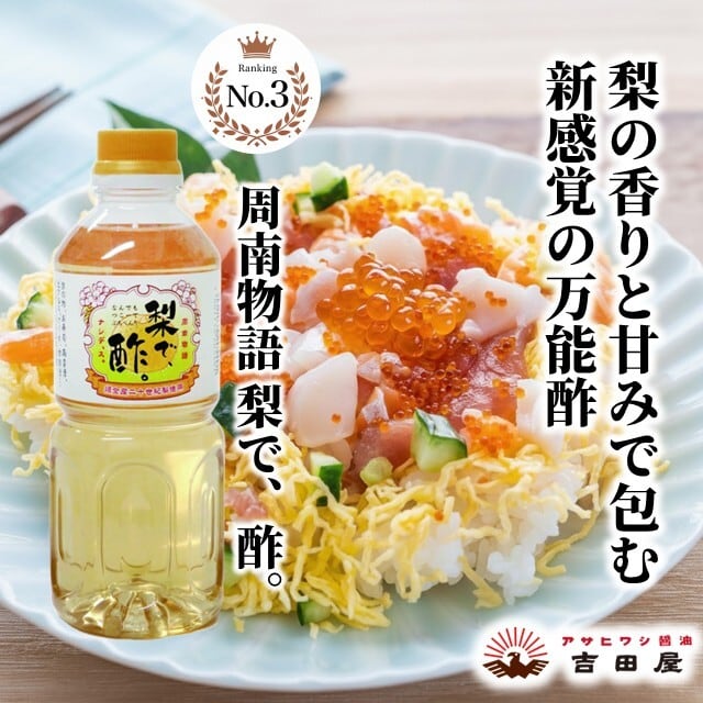 周南市須金の「二十世紀梨」の天然果汁をたっぷりと使用した、甘くてまろやかな酸味が特徴の『新感覚』の調味酢です。